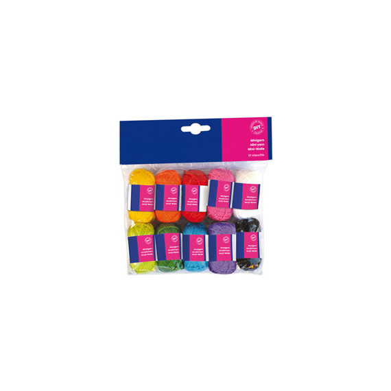 Filati in 100% acrilico, lunghezza 36mt cad. Confezione di 10 matasse in colori assortiti: bianco, giallo, arancione, rosso, viola, rosa, blu, verde chiaro, azzurro e nero.