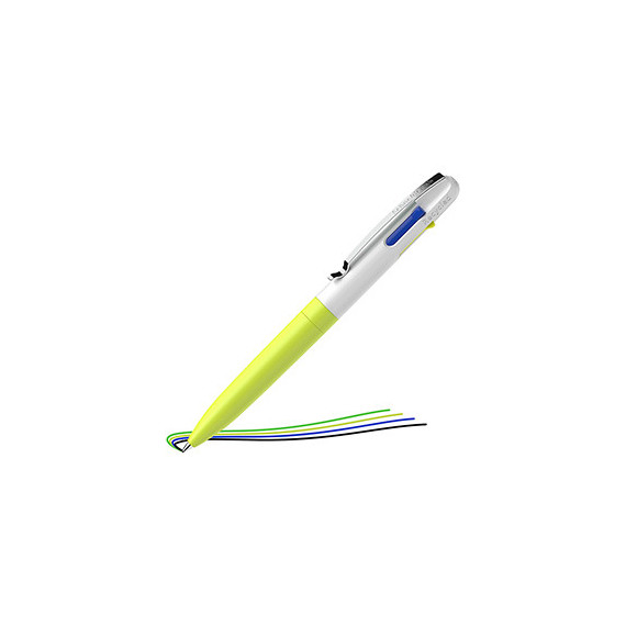 Penna a sfera a quattro colori. Scrive in nero, blu, giallo e verde. Cambio scrittura rapido e agevole grazie ai pulsanti colorati. Realizzata per il 92% in plastica riciclata. Con tecnologia Viscoglide per una scrittura straordinariamente fluida e scorrevole. Punta M. Inchiostro indelibe conforme alla norma ISO12757-2. Dotata di robusto clip in metallo.