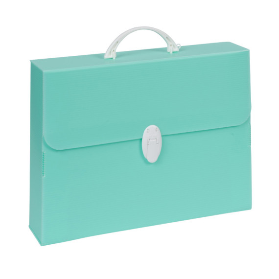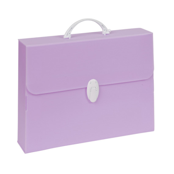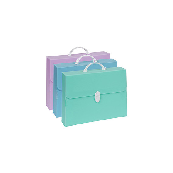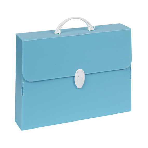 Valigetta in polipropilene alveolare colori pastello assortiti (azzurro, verde, lilla). Maniglia e chiusure in bianco.