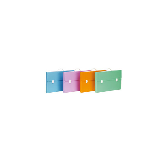 Valigetta in polipropilene alveolare colori pastello assortiti (azzurro, verde, lilla). Maniglia e chiusure in bianco.