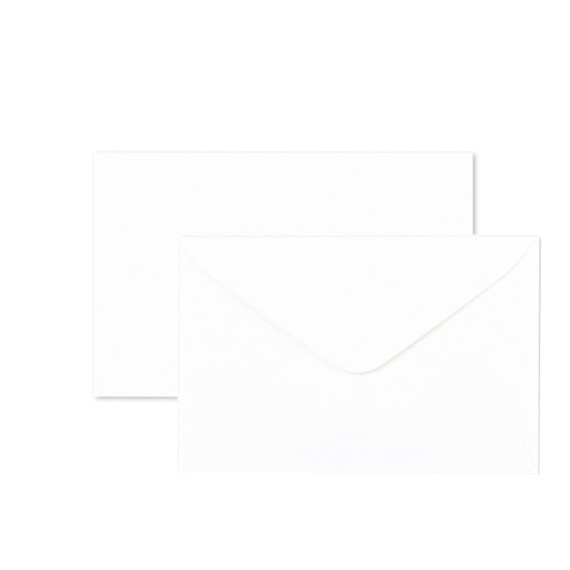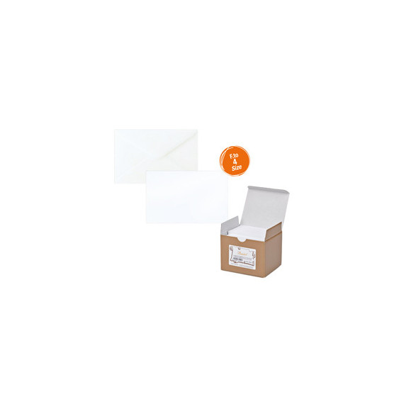 Scatola in cartone con 100 cartoncino bianco da 240gr liscio con 100 buste coordinate con patella e taglio a punta. Formato 4-75x112mm.