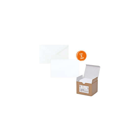 Scatola in cartone con 100 cartoncino bianco da 240gr liscio con 100 buste coordinate con patella e taglio a punta. Formato 9-90x140mm.