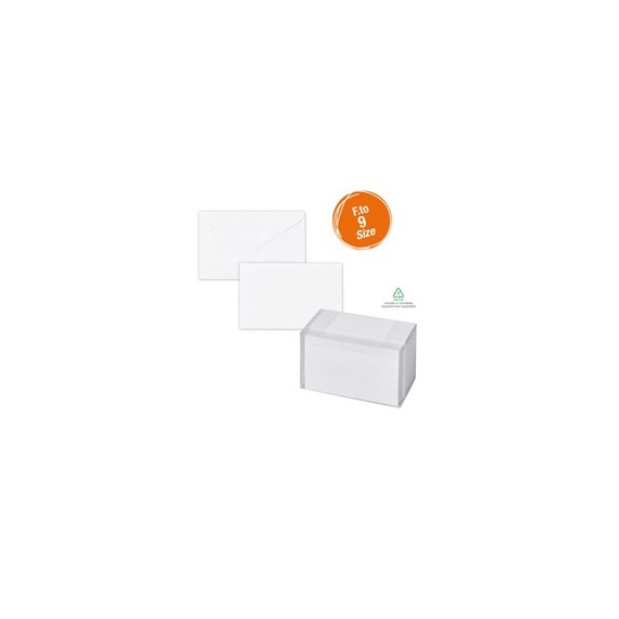 Scatola in acetato trasparente con 100 cartoncini bianco da 200gr liscio con 100 buste coordinate con patella e taglio a punta.Formato 9-90x140mm.
