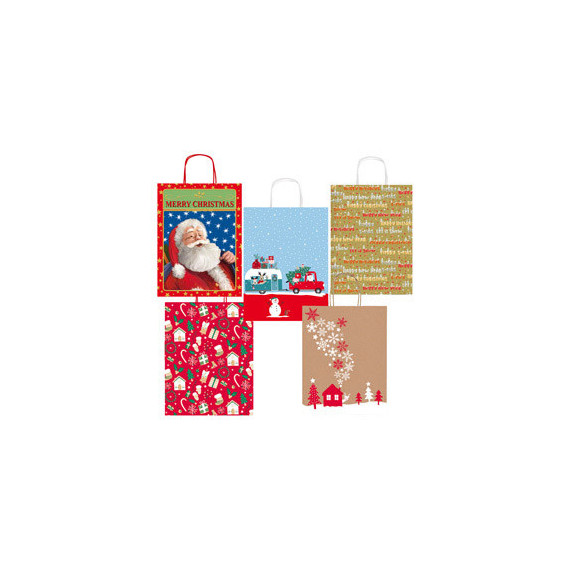 Shopper regalo realizzato in carta kraft bianco con stampe a colori. Dotato di manici in carta ritorta. Assortimento di 5 differente fantasie natalizie.
