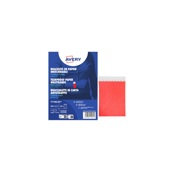 Braccialetti identificativi - in Tyvek - rosso fluo - 265 x 19 mm - 50 fogli - 10 et/fg - Avery - Conf. 500 pezzi