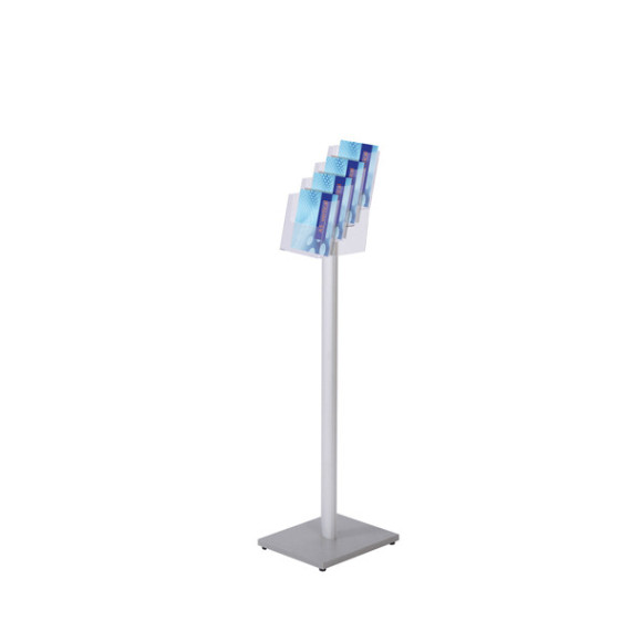 SERIE ECONOMICA. ESPOSITORE CON STELO IN ALLUMINIO, BASE IN MDF LACCATA. A 4 TASCHE A5. Fissaggio delle tasche tramite avvitamento con due viti fornite in dotazione, DIMENSIONI 18X110CM
