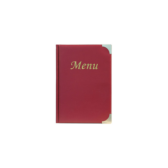 Porta menu' in pvc semplice e classico con angoli in metallo dorato. Formato da 4 buste trasparenti saldate sul dorso e 2 buste saldate sulle facce interne della copertina (per contenere in totale di 10 fogli formato A5