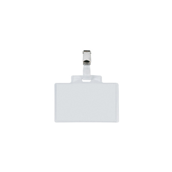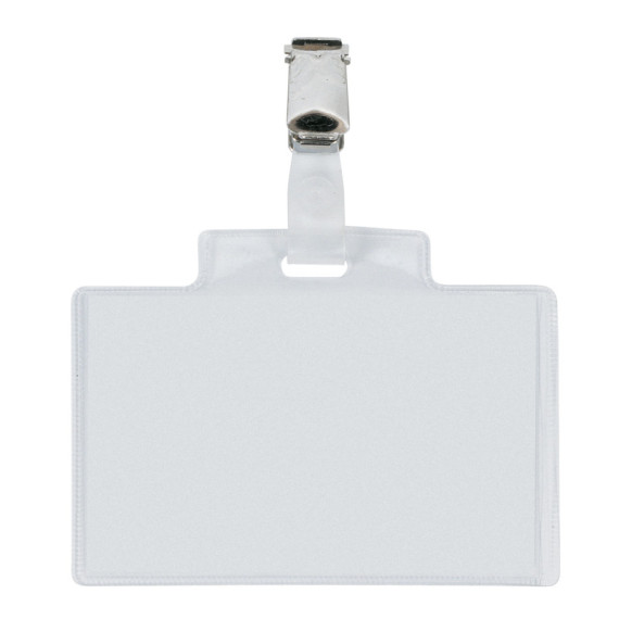 Porta nomi in PVC trasparente, alto spessore, completi di pinzette in metallo e cartoncini. Adatti a congressi, riunioni, visite guidate. Il cartoncino si inserisce dal lato corto. Formato 95x60 mm.