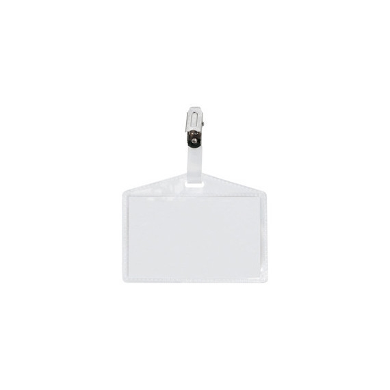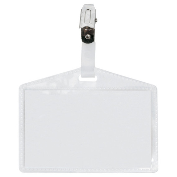 Porta nomi in PP buccia completi di pinzette in metallo (a pinza), senza cartoncino. Apertura lato corto (laterale). Adatti a congressi, riunioni, visite guidate. Formato 95x60mm.