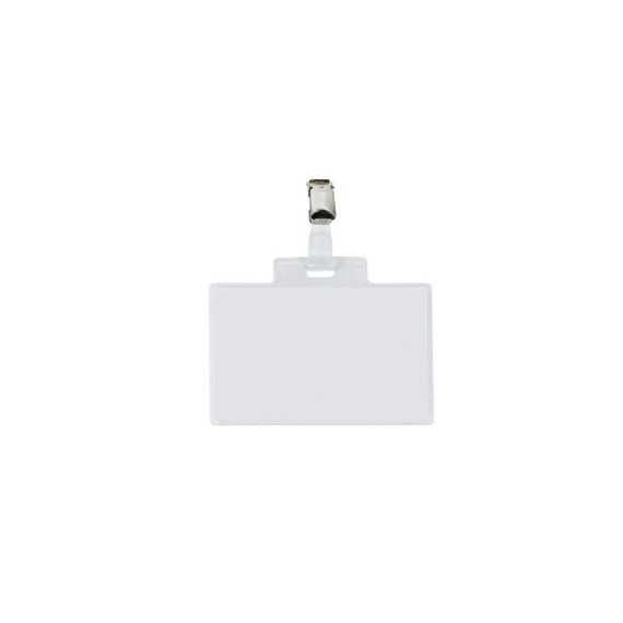Porta nomi in PVC trasparente, alto spessore, completi di pinzette in metallo e cartoncini. Adatti a congressi, riunioni, visite guidate. Il cartoncino si inserisce dal lato corto. Formato 110x70mm.