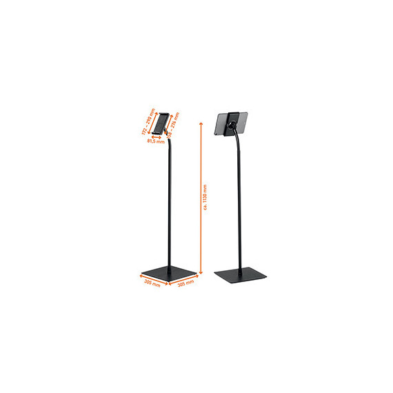 Supporto da pavimento realizzato in materiale ignifugo (conforme alla normativa DIN EN 45545-2) dotato di braccio snodabile e giunto sferico. Compatibile con tablet da 7-13 pollici. Sistema antitaccheggio grazie al bloccaggio delle staffe con chiave speciale e protezione integrata contro la rimozione laterale del tablet, slot per l'aggancio del cavo antitaccheggio (non incluso nella confezione). Particolarmente ergonomico grazie al braccio snodabile che permette la regolazione individuale dell'altezza. Fessura passacavo nella parte inferiore per il passaggio del cavo di ricarica. Ruotabile di 360° con angolo visivo regolabile. Apertura simmetrica delle staffe. Il rivestimento in gomma protegge il dispositivo dai danni accidentali. Utilizzo universale: ad es. in uffici, edifici pubblici, punti vendita e showroom, da casa in home office e in cucina, ecc. Altezza ca. 1130 mm