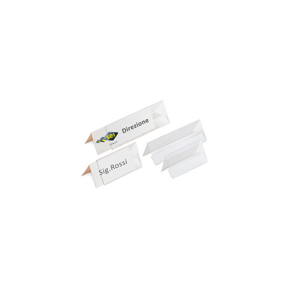 Porta nomi da tavolo in PVC rigido di alto spessore con foglio di etichette stampabili o scrivibili. Adatti a convegni, riunioni, congressi, segna prezzi, targhette identificative. Per mettere sul tavolo nomi e altre informazioni essenziali.