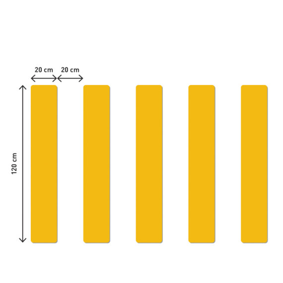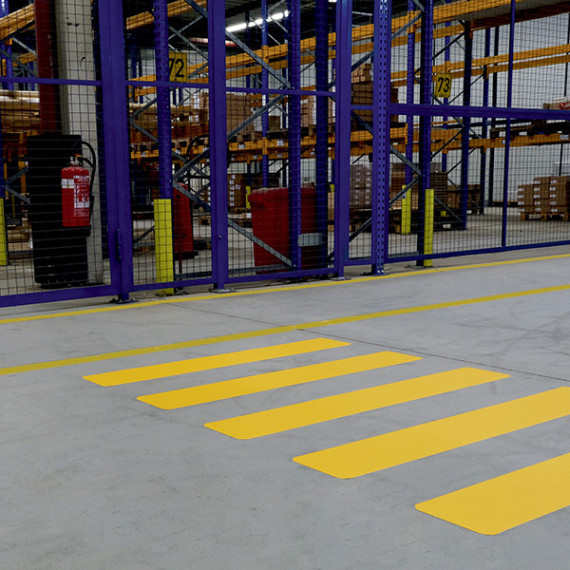 Strisce pedonali adesive per uso interno. Garantiscono una maggiore sicurezza per i pedoni che devono attraversare percorsi trafficati. Resistenza allo scivolamento (gruppo R) R9 conforme all'ordinanza tedesca ASR A1.5-1,2 Pavimenti secondo la norma DIN 51130. Resistente al passaggio dei carrelli elevatori, tranne per i movimenti di frenata e svolta. Applicabili su superfici asciutte, pulite, prive di polvere e grasso. Colore giallo. Dimensioni: 200 × 1.200 mm. Spessore: 0,5 mm. Striscia pedonale di ricambio cod. 104951