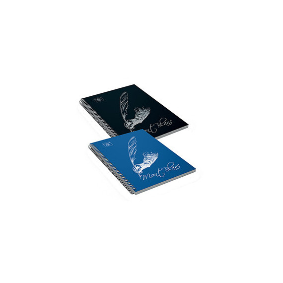 Blocco spiralato sul lato lungo con fori e microperforazione. Copertina patinata opaca soft touch con serigrafia lucida. Doppio risguardo da 100 gr. Confezione da 5 blocchi in 2 colori assortiti (nero/blu).