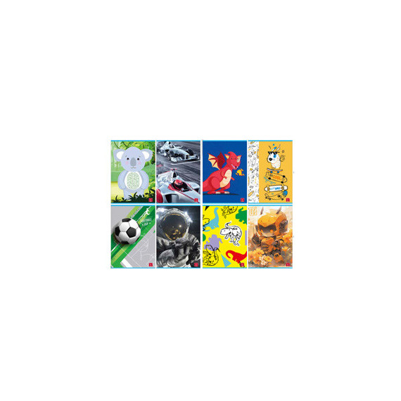 Maxiquaderno rilegato con punto metallico. Copertina in cartoncino da 205gr verniciatura UV. Risguardo personalizzabile stampato fronte e retro. Fantasie assortite 2023.