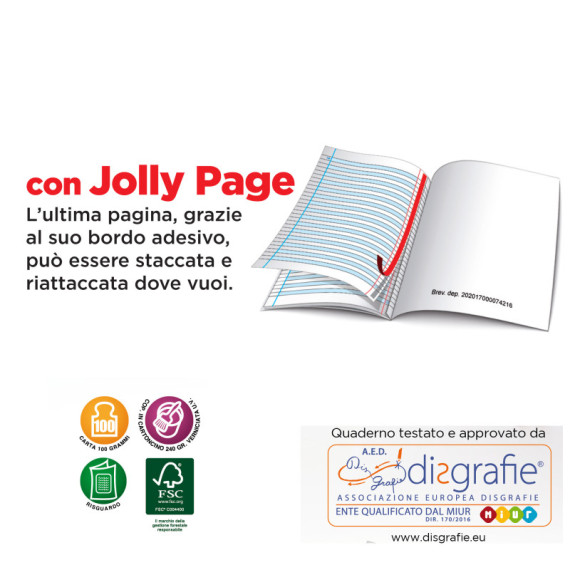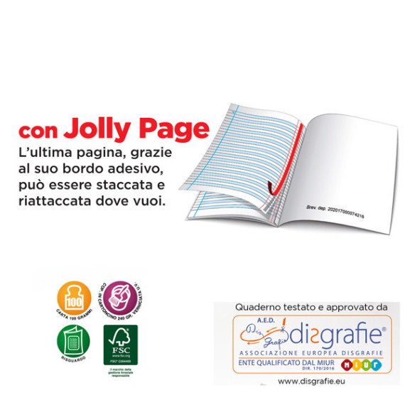 Maxiquaderno rilegatura a punto metallico. 18 fogli + risguardo (72 facciate scrivibili). Carta da 100g/mq. certificata FSC. Copertina stampata pantone in colori assortiti, cartoncino da 240 gr/mq. Formato 21x29,7cm. Un quaderno utile a tutti. Per chi desidera scrivere in modo ordinato e per chi ha bisogno di una riga dritta da seguire. Il quaderno è stato progettato e realizzato in accordo alle linee guida sulla disgrafia. Presenta i necessari riferimenti cromatici per compensare il difetto di scrittura. Estremamente resistente alle cancellature e ai segni dell'uso quotidiano. Confezione assortita in 5 colori brillanti. Inclusa in ogni quaderno la pagina adesiva Jolly Page.