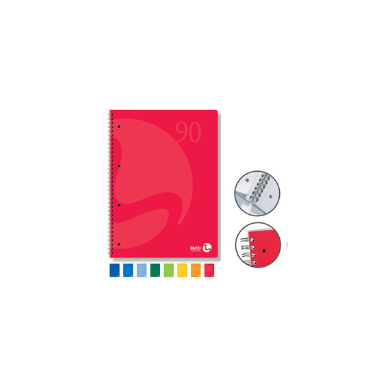 Quaderno spiratalo sul lato lungo. 2 copertine da 300gr stampata fronte-retro assortite in 8 colori. Copertina con plastificazione opaca e verniciatura serigrafica lucida. 4 fori e microperforatura. Carta bianca in pura cellulosa da 90gr.