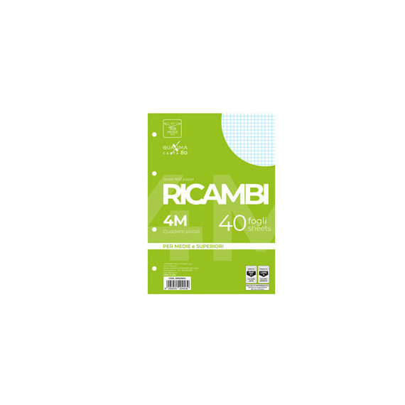Ricambi forati f.to A5 bianchi. 40 fogli carta 80gr. Rigatura: 4mm