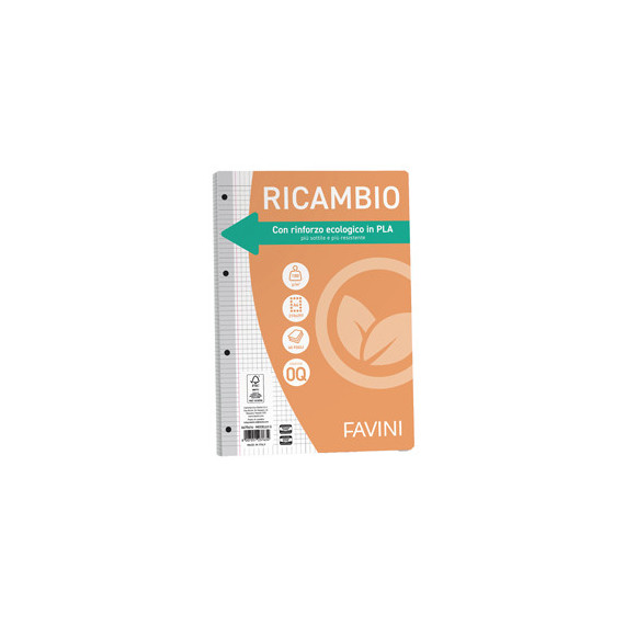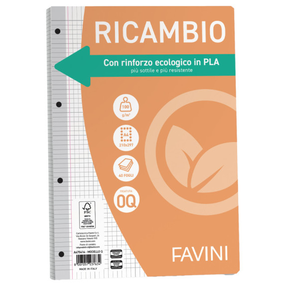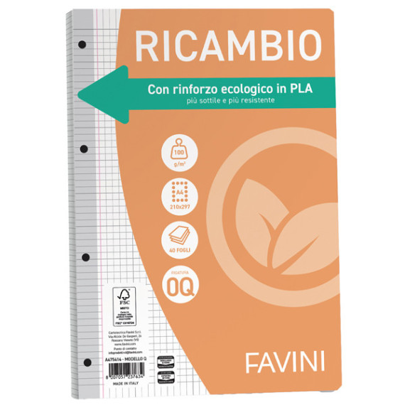 Ricambi con rinforzo in bioplastica, da risorse vegetali rinnovabili e biocompostabile. Formato A4 - 21x29,7cm.Carta da 100gr.