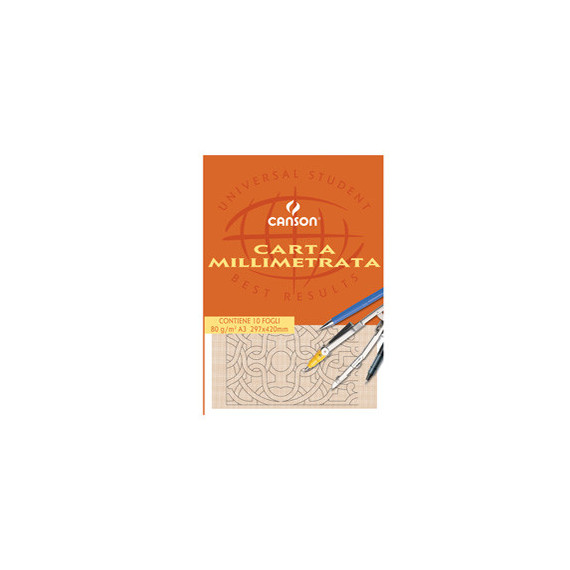Carta trasparente opaca millimetrata Canson da disegno. Si presta in particolare agli usi tecnici e manuali, a matita ed ad inchiostro. In formato A3 da 80gr/m, quadrettatura colore arancio.