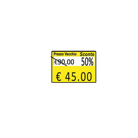 Rotolo da 600 etichette rettangolari 26x19mm removibile giallo con dicitura taglio prezzo + sconto. Confezione 10 rotoli.