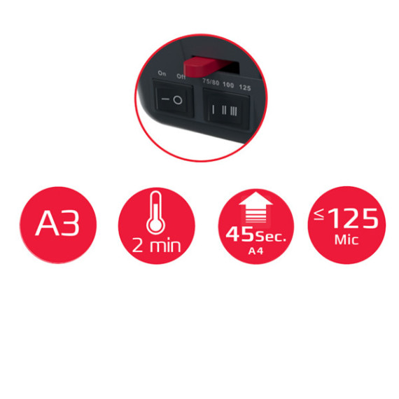 GBC 240HS è una soluzione elegante ed efficiente per le esigenze di plastificazione di tutti i giorni. Progettata all'insegna dello stile e delle prestazioni, questa plastificatrice A3 ad alta velocità è ideale per l'utilizzo a casa o in ufficio. Aumenta la produttività e riduci i tempi di plastificazione del 33% utilizzando le pouches ad alta velocità GBC. Con un tempo di riscaldamento di 2 minuti, plastifica un foglio A4 da 75 micron in soli 45 secondi, rendendolo perfetto per gestire in modo efficiente i tuoi progetti domestici. L'interruttore di controllo, facile da usare, offre tre impostazioni di spessore della pouches da 75 a 125 micron, garantendo flessibilità per vari tipi di documenti. Una leva di sblocco anti-inceppamento assicura un funzionamento regolare, risolvendo senza sforzo eventuali errori di inserimento delle pouches. Inoltre, il sistema intelligente di LED di stato semplifica il funziona mento con chiare indicazioni visive e acustiche: rosso durante il riscaldamento, blu con un suono quando è pronto e spegnimento automatico dopo 15 minuti di inattività per risparmiare energia. Proteggi e conserva i tuoi documenti importanti con una finitura perfet ta, ogni volta. Colore nero e rosso. Plastifica carte d'identità fino a documenti di formato A3. Plastifica un documento A4 (75 mic) in soli 45 secondi. Plastifica 13 x A4 in 10 minuti. LED di stato SMART: si illumina di rosso durante il riscaldamento e diventa blu con un segnale acustico quando la plastificatrice è pronta all'uso. La leva di rilascio degli inceppamenti consente di rimuovere manualmente le pouches errate o inceppate. Include una confezione iniziale di 5x pouches A4 (75 micron). Basso livello di rumore <(><<)>50Dba per ridurre le distrazioni. Certificato CE, TUV/GS.