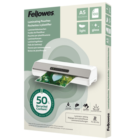 Pouches riciclate - A5 - 2x80 micron - Fellowes - scatola 100 pezzi