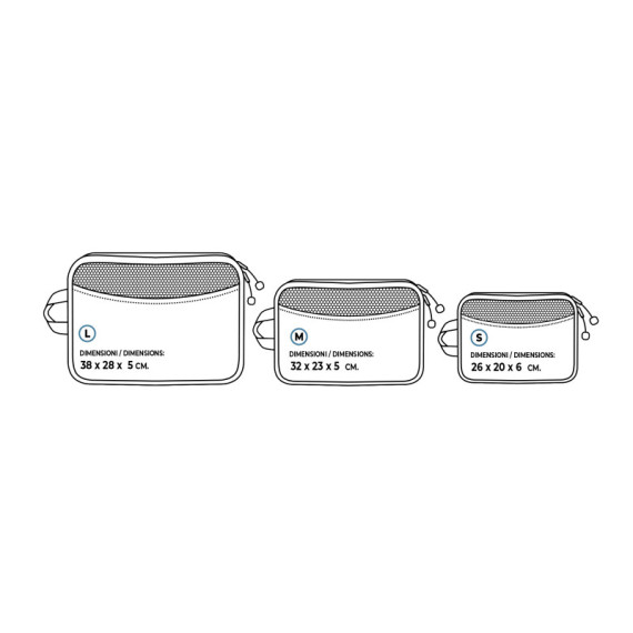 Set 3 organizer realizzati in tessuto tecnico resistente all'acqua e facile da pulire. Parte superiore con tessuto a rete, apertura con doppia zip. Appendibili. Dimensioni assortite: 38x28x5cm, 32x23x5cm e 26x20x6cm.
