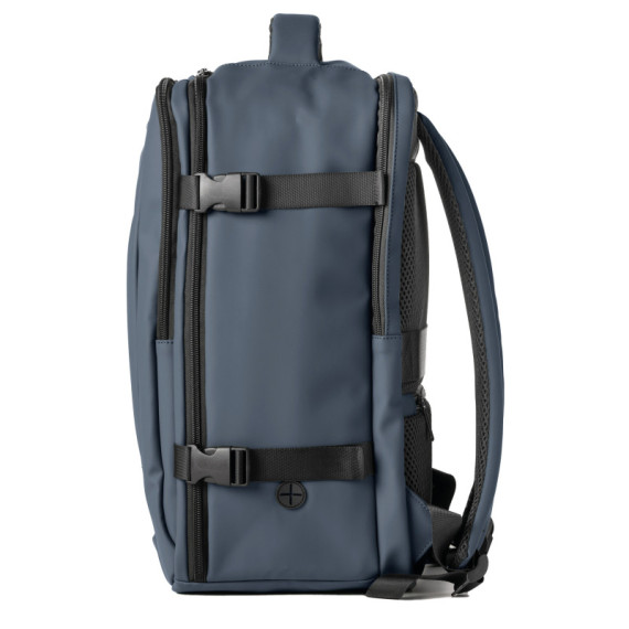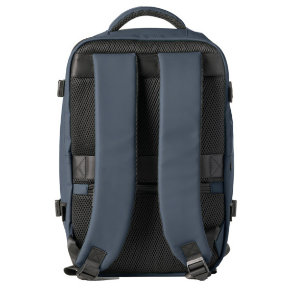 Zaino in gomma antipioggia, tasca frontale portachiavi e tasca frontale portadocumenti. Grande vano centrale con tasche porta accessori, presa esterna per cuffie. Tasca posteriore porta notebook 15”. Tasca posteriore e nastro per inserimento su trolley. Tracolle e schienale imbottite e dotato di maniglia di trasporto. Cinghie laterali per compressione. Bagaglio a mano approvato Ryanair.