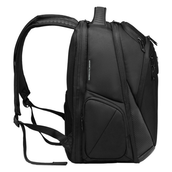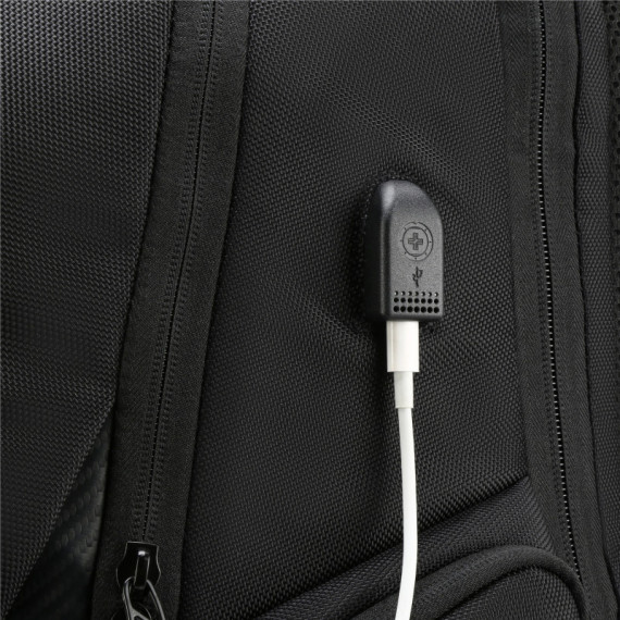 Zaino in poliestere dotato di tre scomparti frontali con vari alloggiamenti interni. Scomparto posteriore con apertura totale. Tasca con protezione RFID. Sistema di ricarica intelligente che prevede un cavo con presa USB incorporato in dotazione con attacco all'esterno dello zaino. Custodia imbottita per laptop (15“). Custodie protettive modellate per smartphone e powerbank. Tasca superiore per occhiali e 2 tasche laterali con cerniera. Varie tasche interne. Schienale imbottito mesh con passante per trolley. Maniglia e spalline imbottite. Dimensioni 48 x 33,5 x 24,5 cm, volume 37L, peso 1,4kg.