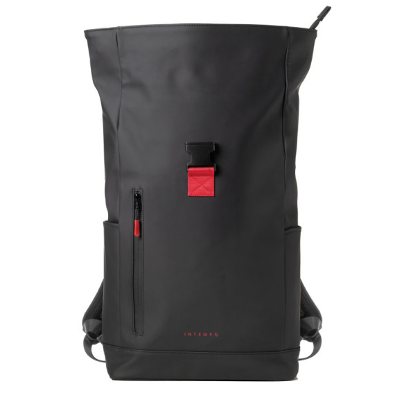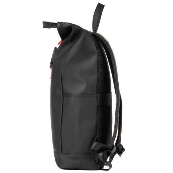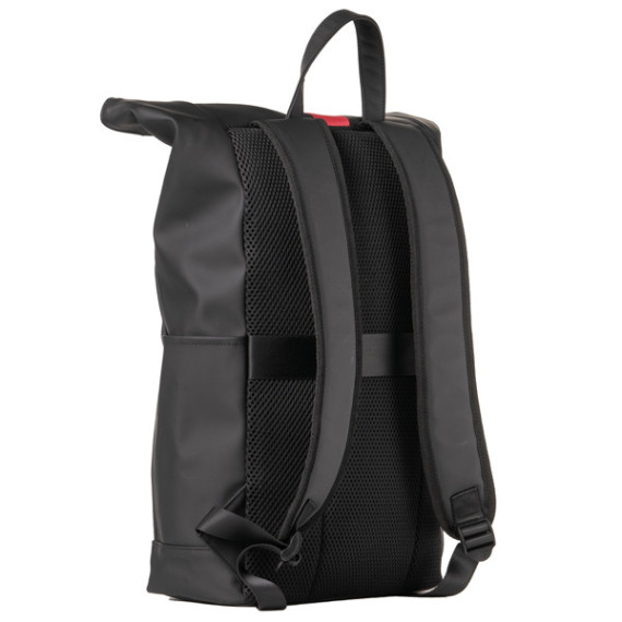 Zaino roll-top in gomma antipioggia, tasca frontale portachiavi e accessori. Grande vano centrale con all’interno guscio estraibile per notebook 15”. Doppia tasca laterale per borraccia e ombrello, schienale e tracolle imbotite, maniglia per il trasporto.