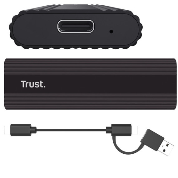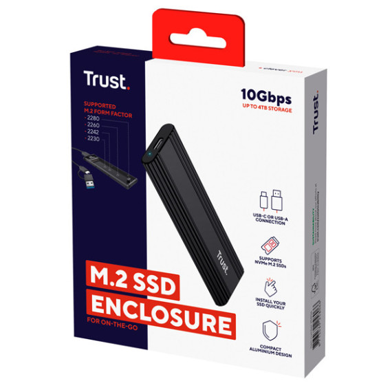 Custodia Trust USB-C per SSD M.2 (25806): compatibile con laptop, smartphone e tablet USB-C/USB-A. Supporta SSD M.2 NVMe fino a 4 TB, velocità fino a 10 Gbps. Compatta, in alluminio, include cavo, adattatore, cacciavite e viti per installazione rapida.