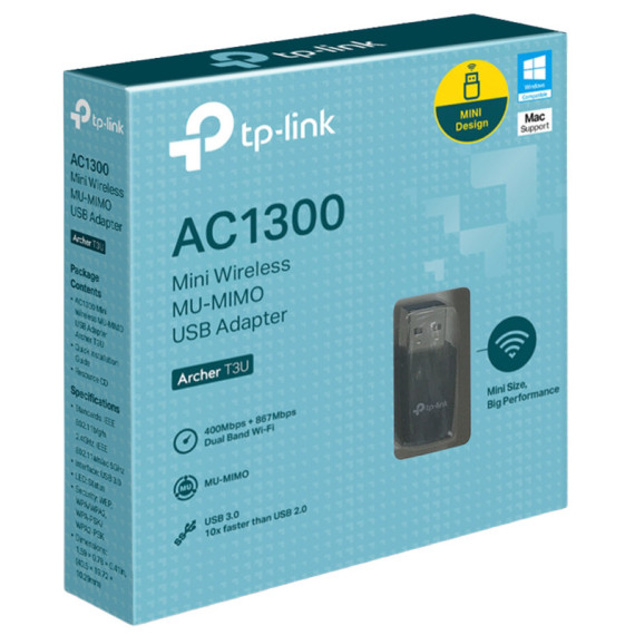 Archer T3U sfrutta la tecnologia wireless AC per connessioni fino a 3 volte più rapide rispetto agli standard precedenti. Wi-Fi ad alta velocità (fino a 867Mbps sulla banda 5GHz e 400Mbps sulla banda 2.4GHz) per supportarti nelle tue attività di navigazione quotidiane e in attività ad alto utilizzo di banda, come lo streaming HD e il gaming online. Wi-Fi AC1300 – Due bande per una velocità combinata fino a 1300Mbps (400Mbps 2.4GHz e 867Mbps 5GHz). Design compatto – Per la massima comodità anche in viaggio Compatibilità – Supporto Windows 11*/10/8.1/8/7/XP, Mac OS X Tecnologia MU-MIMO – Per una connessione wireless ancora più efficiente Adattatore USB 3.0 – Trasferimento dati fino a 10 volte più rapido rispetto allo standard USB 2.0