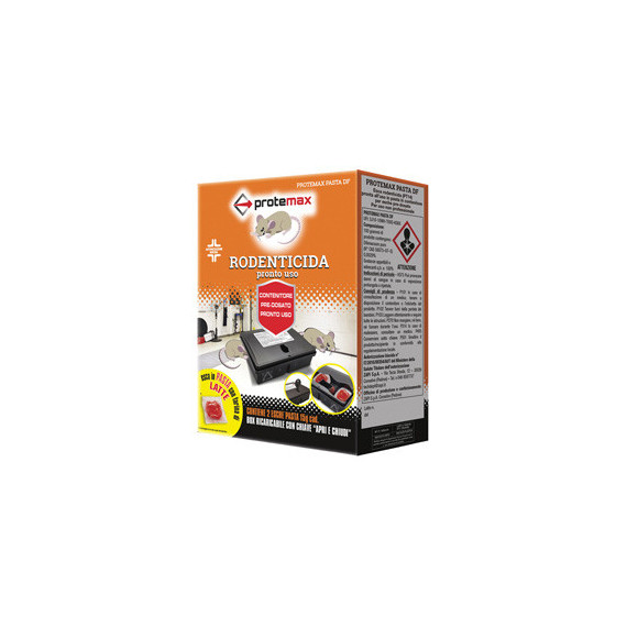 Box predosato con esca peer topi altamente appetibile ed efficace. Esca rodenticida in pasta fluo inserita in un contenitore di sicurezza in plastica trasparente, dotato di chiave per l’apertura e chiusura. Una volta consumata l’esca il contenitore può essere utilizzato per successivi trattamenti reintegrando l’esca topicida. Indicato per: il controllo del Topo domestico (Mus musculus). Uso all’interno degli edifici. Principio attivo: Brodifacoum puro (N° CAS 56073–10–0) 0,0029%. Registrazione: PROTEMAX TOPO KILL BOX Autorizzazione biocida n° IT/2018/00490/MRS DI LIBERA VENDITA. Dimensioni:13x9x4 h cm diam. foro entrata 2,5 cm.