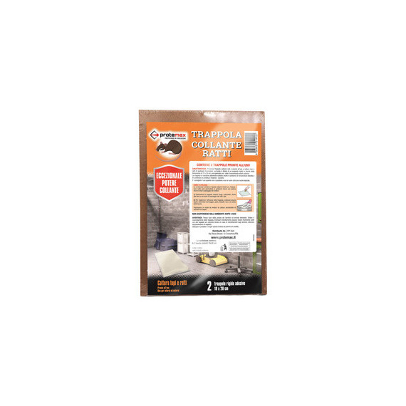 Blister contenente 2 tavolette rigide in faesite con dimensioni cm 19x28 cm pre-spalmate di colla ad alto potere adesivo, idonee alla cattura di topi e ratti. Si consiglia l’aggiunta al centro della trappola di esche alimentari (formaggio-pane-frutta) per aumentare la possibilità di catture. Indicato per: ambienti interni domestici (cucine, garages, cantine, soffitte) ma anche per uso esterno, essendo resistente alla pioggia. ATTENZIONE: Vendita di colle e trappole collanti per la cattura mammiferi, fra cui i roditori, rettili, anfibi ed uccelli: per la conformità normativa della vendita di tali prodotti, è necessario verificare, preliminarmente, le eventuali disposizioni in materia stabilite dalle ordinanze comunali vigenti.