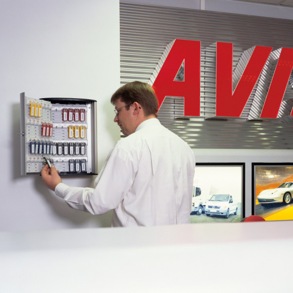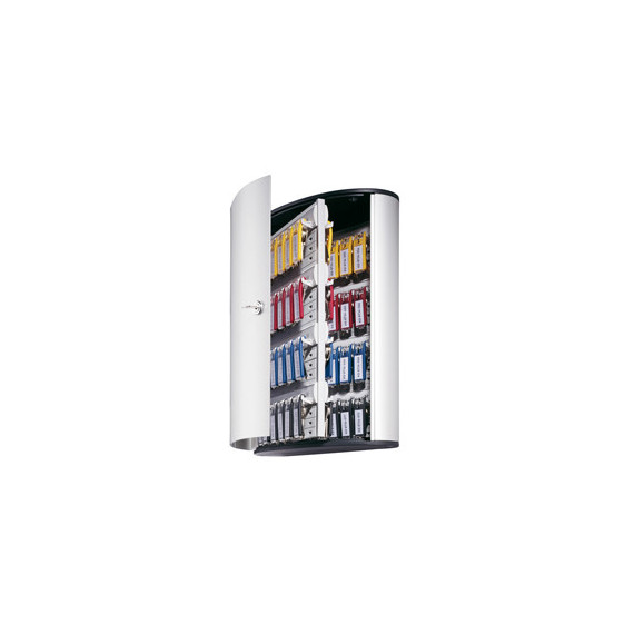 Cassetta portachiavi da muro. Realizzata in alluminio con capacità di 72 chiavi. Lo sportello si apre a più di 90 gradi per facilitare l'accesso alle chiavi. Chiusura con serratutra e 2 chiavi numerate che possono essere sostituite in caso di perdita o rottura. I particolari pannelli interni permettono alle barre portachiavi di essere agganciate all'altezza desiderata assicurando un'alta versatilità di gestione. Include 6 portachiavi art.1957 in colori assortiti. Dimensioni: 30,2x11,8x40cm.