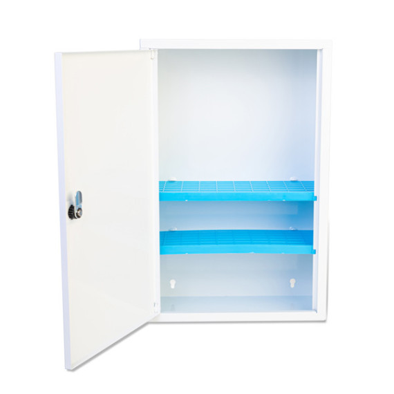 Armadietto in metallo verniciato con polvere epossidica di colore bianco. Dotato di 3 vani con 2 ripiani interni. Serratura con chiave. Dimensioni: 46x30x14cm. Contenuto: kit allegato 1 + termometro + sfigmomanometro.