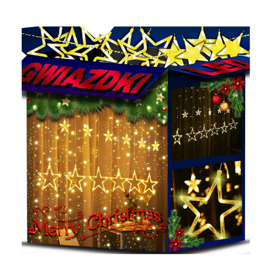 Porta brillantezza e fascino al tuo spazio con queste splendide tende luminose a LED a forma di stella. Con 120 LED giallo caldo distribuiti su una lunghezza di 4,7 metri, questa catena luminosa è ideale per vetrine, decorazioni murali o fondali festivi.