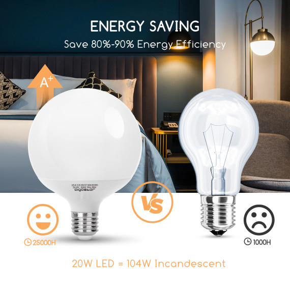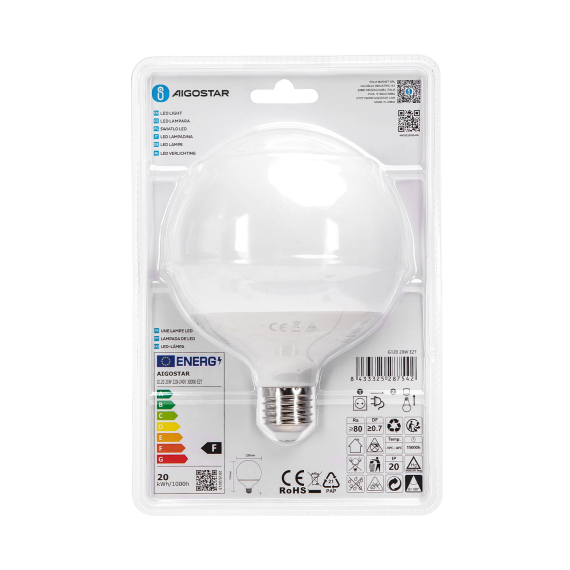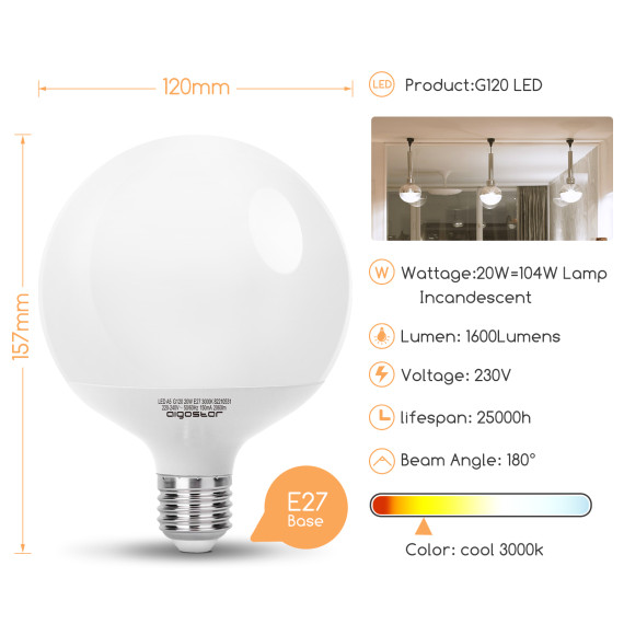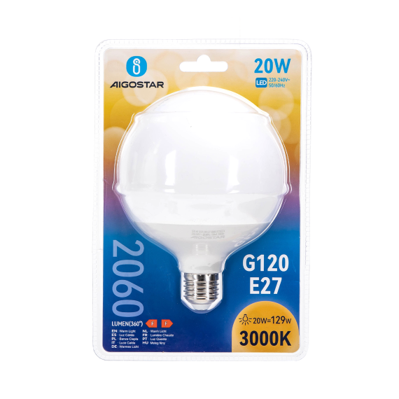 Lampadina led G120 20W attacco E27 2060 lumen 3000K luce calda misura D120xH157mm Equivale a 129w a incandescenza