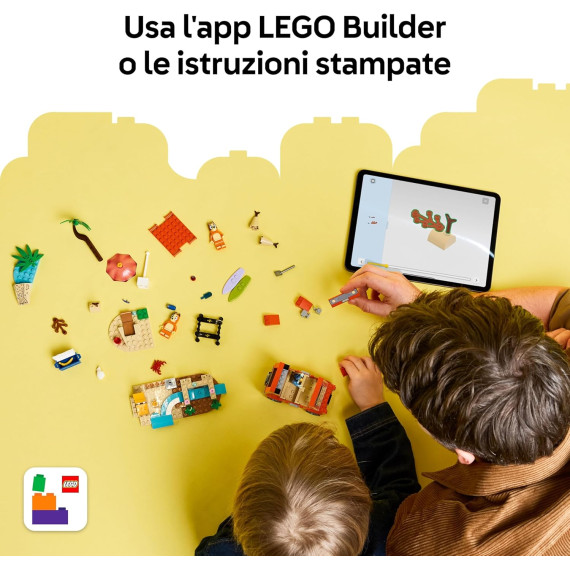 Questo giocattolo LEGO® contiene l’iconico veicolo dello show Bluey, con 2 tavole da surf sul tetto e un bagagliaio sul retro in cui riporre la borsa frigo. Il tetto apribile dell’auto consente ai bambini di accedere facilmente all’interno, dove si trovano i sedili per le minifigure di Bluey, Bingo e Chilli (la mamma di Bluey). Le caratteristiche della spiaggia che ispirano il gioco d’immaginazione includono un imponente castello di sabbia, una coda di sirena di sabbia in cui può essere posizionata una minifigure, una sedia reclinabile, un ombrellone e una palma. Gli accessori includono un granchio, un gelato, occhiali da sole e crema solare.