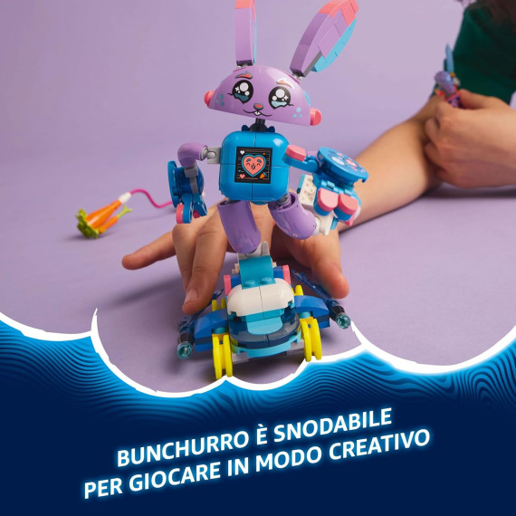 I giovani sognatori si divertiranno a costruire il personaggio di Bunchurro, una nuova fantastica versione del coniglietto Bunchu, dotato di uno schermo per videogiochi nella pancia e indossa guanti e sneaker “gaming controller”, prima di scoprire 2 modi per trasformarlo. Possono accessoriare il modello del coniglio con uno skateboard e booster o un fantastico jetpack. Il coniglio giocattolo è altamente snodabile in tutte le modalità e l’azione è portata in vita con la una minifigure di Izzie, posizionabile sulla schiena di Bunchurro per incoraggiare il gioco di ruolo di fantasia.