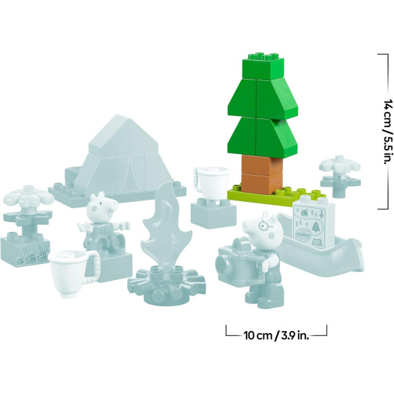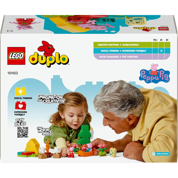 - Divertente avventura LEGO® DUPLO® per i più piccoli: i bambini in età prescolare aiutano Peppa Pig e Papà Pig ad allestire l’accampamento e a montare la tenda, quindi inventano storie creative da mettere in scena con la loro canoa giocattolo
