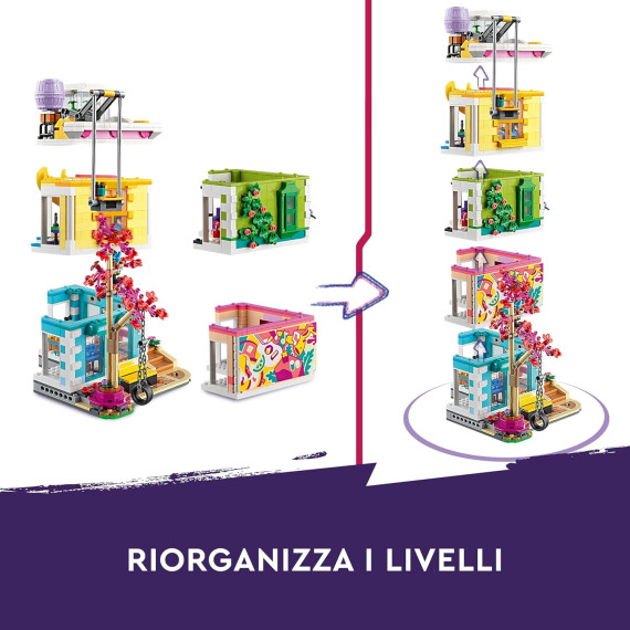 - Personalizza l’edificio: lo stile modulare consente ai bambini di riorganizzare ivari livelli a loro piacimento. Il set può essere combinato con la Cucina comunitaria di Heartlake City (41747) per creare storie ancora più grandi