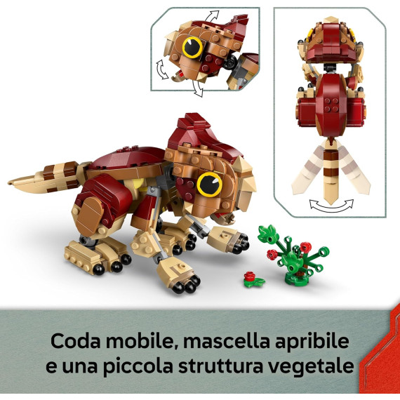 Le avventure attendono i bambini e i fan dai 7 anni in su che vogliono avviare o arricchire la loro collezione di dinosauri con questo divertente set Dinosauro cucciolo Dolores: Aquilops LEGO® Jurassic World (76970). Questo kit di costruzione per il gioco e l’esposizione contiene un personaggio di cucciolo di dinosauro Aquilops in mattoncini per bambini e una pianta costruibile con fiori. Il modello di Baby Dolores ha la testa, le braccia e le gambe mobili che favoriscono una serie di pose, oltre a una coda mobile e una mascella che si apre per mostrare la sua gioia quando mangia il suo pasto a base di piante. Una volta terminata la giornata di gioco, questo simpatico modello di dinosauro può essere collocato su una mensola o sulla scrivania per fare bella mostra di sé.