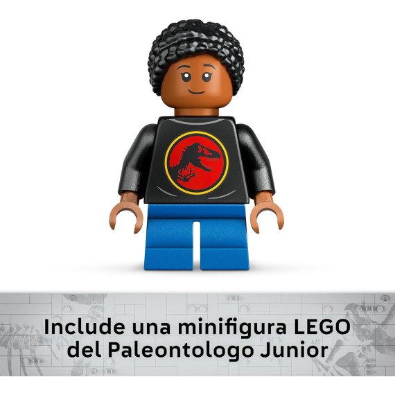 - Kit di costruzione con dinosauro: contiene un teschio di Triceratopo con supporto, targa informativa, targa del sito di scavo con mini-fossili e attrezzi di scavo, minifigure del Paleontologo Junior LEGO® e un pezzo di “ambra”
