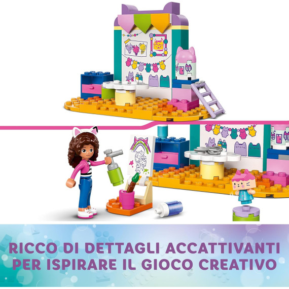Questo giocattolo LEGO per i bambini e le bambine è anche un playset arts-and-crafts. Il set da costruzione per il gioco di finzione include un pennello, tempera, forbici e una bomboletta spray, oltre alla mini-doll di Gabby e al personaggio di Baby Scatola. Insieme, Gabby e Baby Scatola dipingono un quadro e costruiscono un modello della casa delle bambole di Gabby. C’è anche una scala per aiutare i personaggi a raggiungere la cima del modello. Il set da gioco ha una parete con opere d’arte e orecchie di gatto che sporgono dalla parte superiore. Ricco di dettagli accattivanti per ispirare il gioco creativo, il set contiene uno Starter Brick per aiutare i bambini a iniziare a costruire. Le istruzioni intuitive sono fornite sotto forma di una colorata guida con storie illustrate.