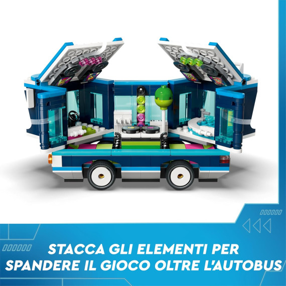 Il set include 4 personaggidei Minions: Phil, Mel, Dave e il Mega Minion volante, Gus, che fa la sua prima apparizione nel film Cattivissimo me 4. L’autobus ha un posto di guida e una barra sul tetto alla quale Gus può aggrapparsi. Si apre a metà da un lato e il tetto può essere sollevato per rivelare una pista da ballo, una postazione DJ, una chitarra elettrica, un pianoforte, un microfono, luci, altoparlanti e una vasca idromassaggio! Molti elementi si staccano per espandere il gioco oltre l’autobus. Questo divertente giocattolo per bambini è ricco di colori vivaci e fantastici accessori, tra cui una bandiera, un palloncino, un gelato, cappelli, bevande, luci, altoparlanti e schermi. I bambini possono anche divertirsi in formato digitale nell’app LEGO Builder.