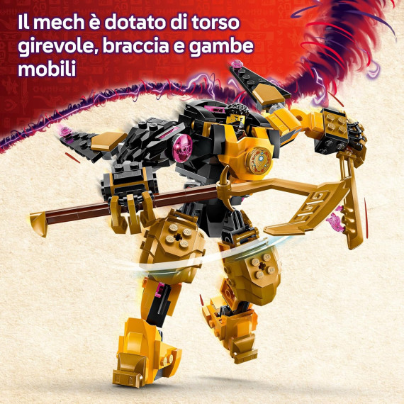 - Costruisci il tuo mech: i bambini possono mischiare e abbinare le partidel corpo e le armi di questo mech con i mech personalizzabili della gamma NINJAGO® 2024 (disponibili separatamente) per creare il loro personaggio mech definitivo