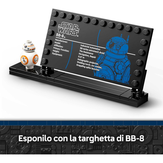 - PERSONAGGIO DI BB-8 LEGO®: esponi il modello giocattolo costruibile principale con la targhetta informativa di BB-8 e il personaggio LEGO BB-8 di dimensioni standard