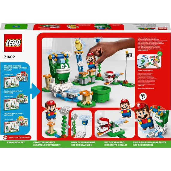 Grazie al Pack espansione Sfida sulle nuvole di Spike gigante (71409), i bambini possono creare un livello cielo LEGO® Super Mario™ tutto loro. Il Pack include le sfide dei videogiochi di Super Mario™ e i personaggi LEGO di 3 famosi nemici: uno Spike gigante, un Boomerang Bros e una Pianta Piranha. I giocatori possono ottenere monete digitali aiutando i personaggi di LEGO® Mario™, LEGO® Luigi™ o LEGO® Peach™ (non inclusi) a sconfiggere lo Spike gigante, saltare sui trampolini-fungo arancioni per raggiungere il Boomerang Bros, utilizzare il Blocco Super Stella e molto altro (nota: per il gioco è richiesto lo Starter Pack 71360, 71387 o 71403).
